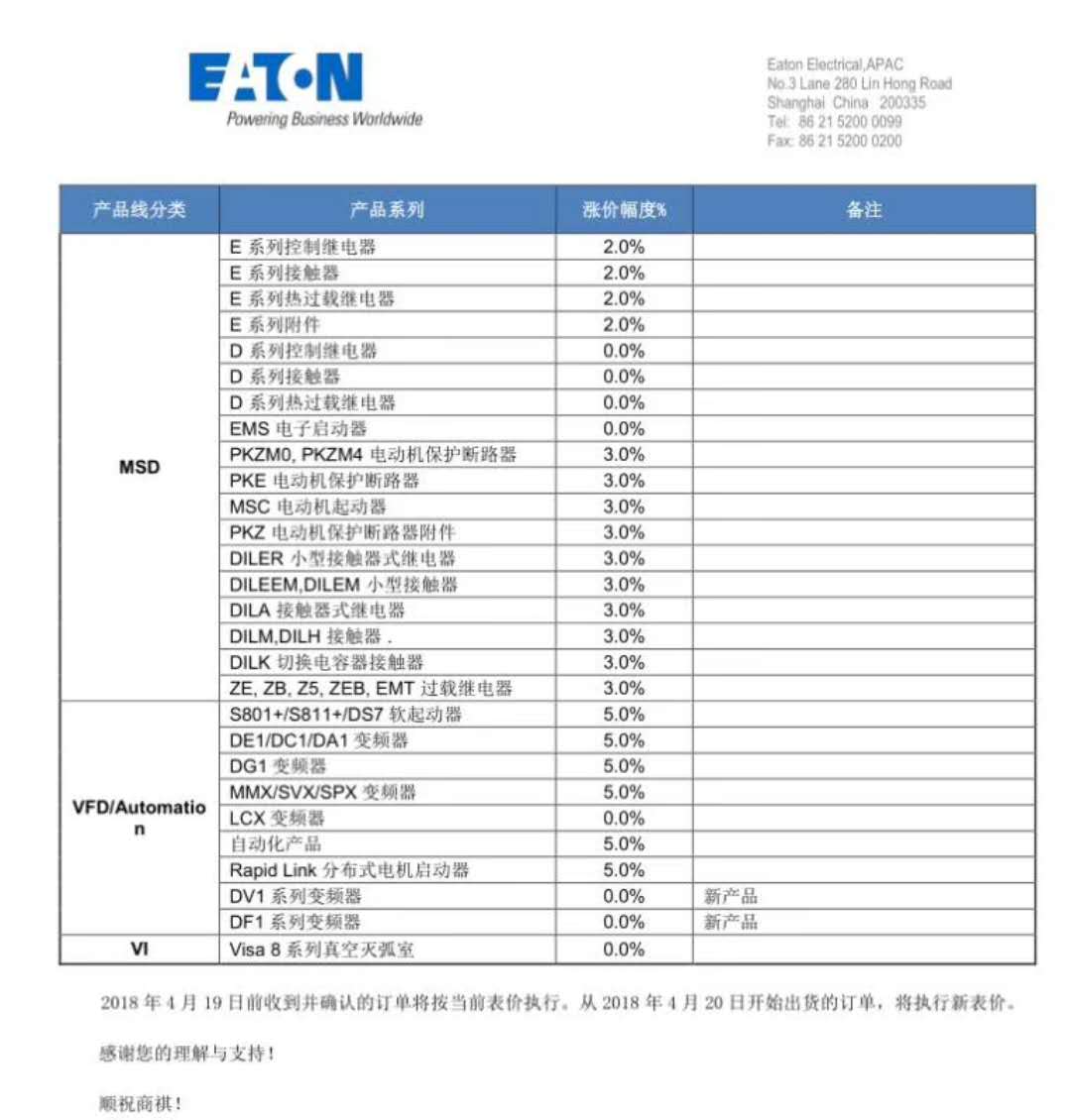 EATON伊顿穆功18年价格调整